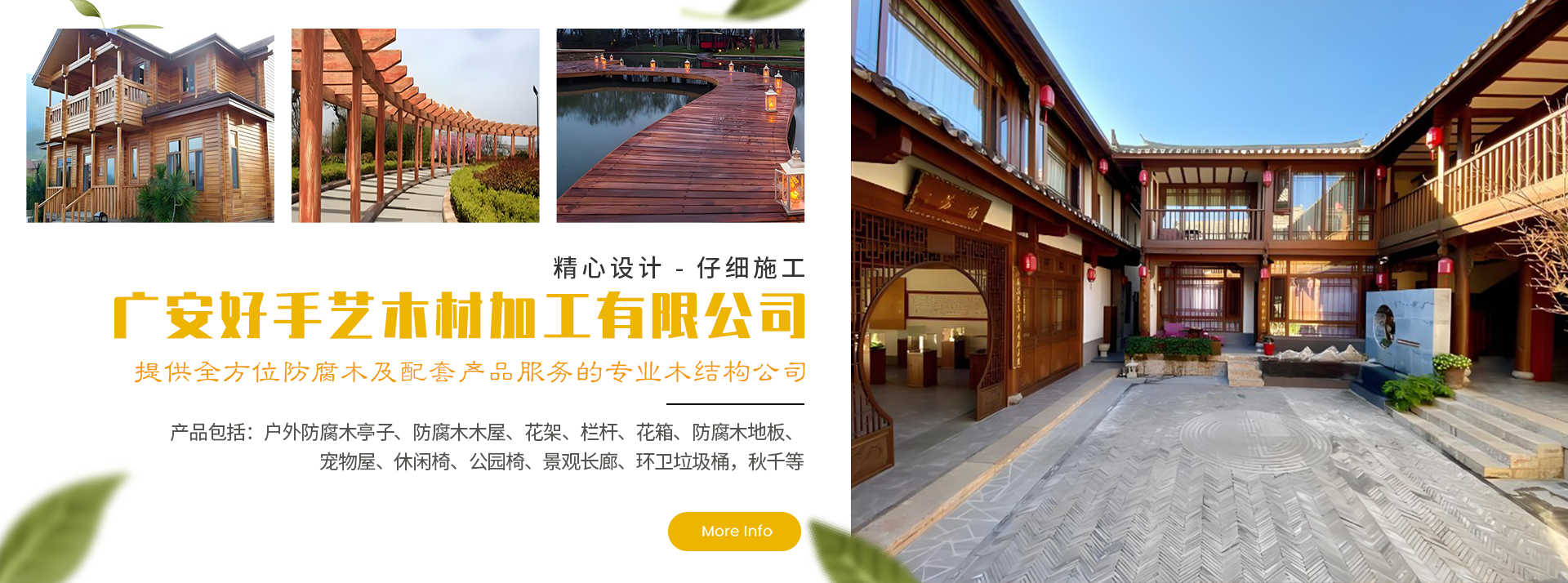 廣安好手藝木材加工有限公司專業從事防腐木木材的生產及銷售,企業立足防腐木材生產、銷售、設計、咨詢為一體的綜合性企業,產品包括:戶外防腐木亭子、防腐木木屋、花架、欄桿、花箱、防腐木地板、寵物屋、休閑椅、公園椅、景觀長廊、環衛垃圾桶,秋千等公共配套設施的生產、銷售、安裝。
